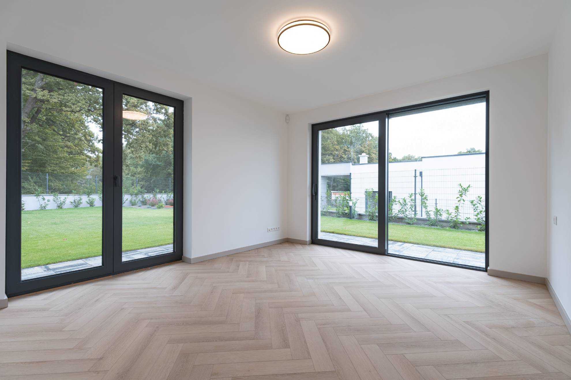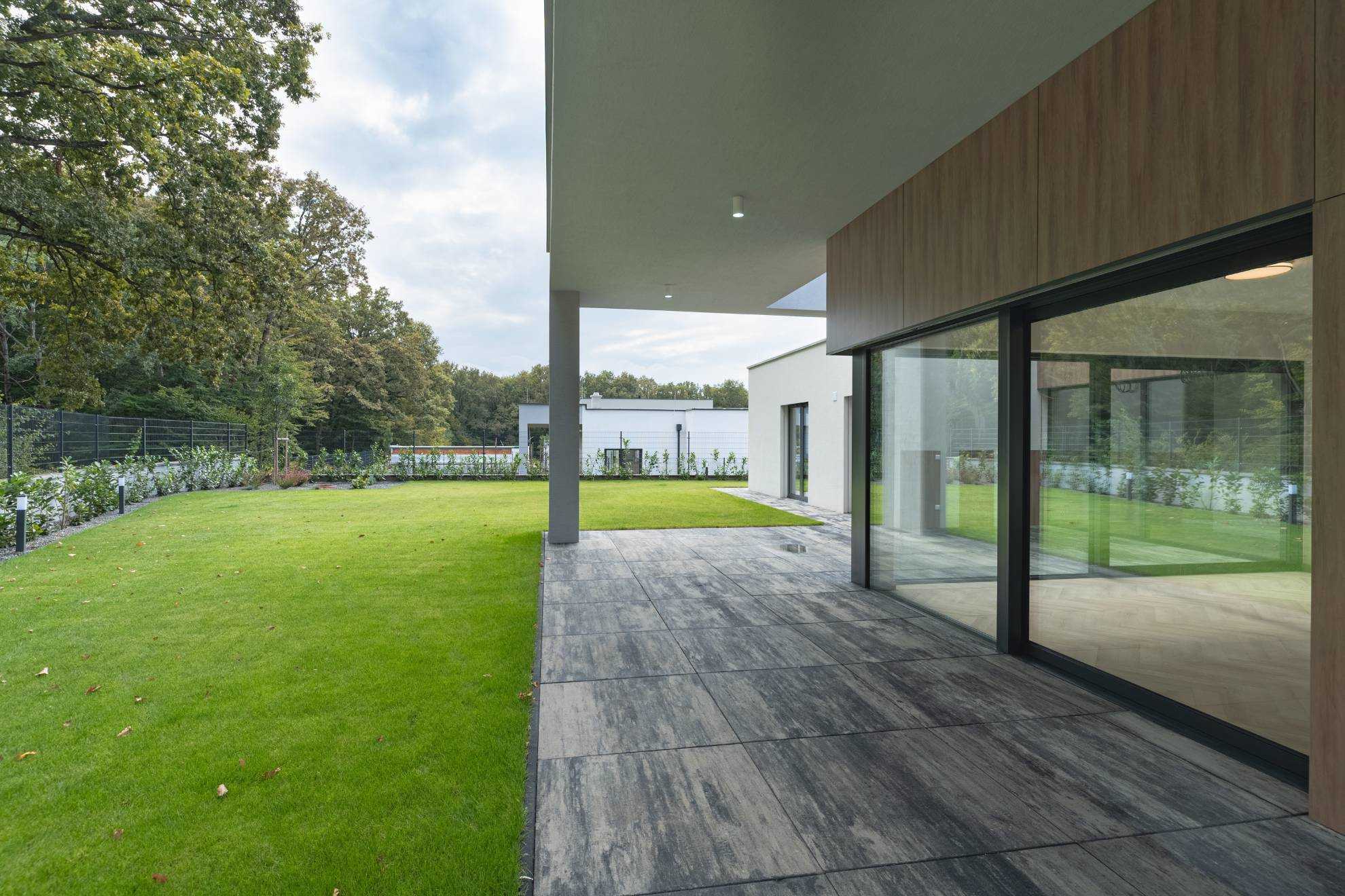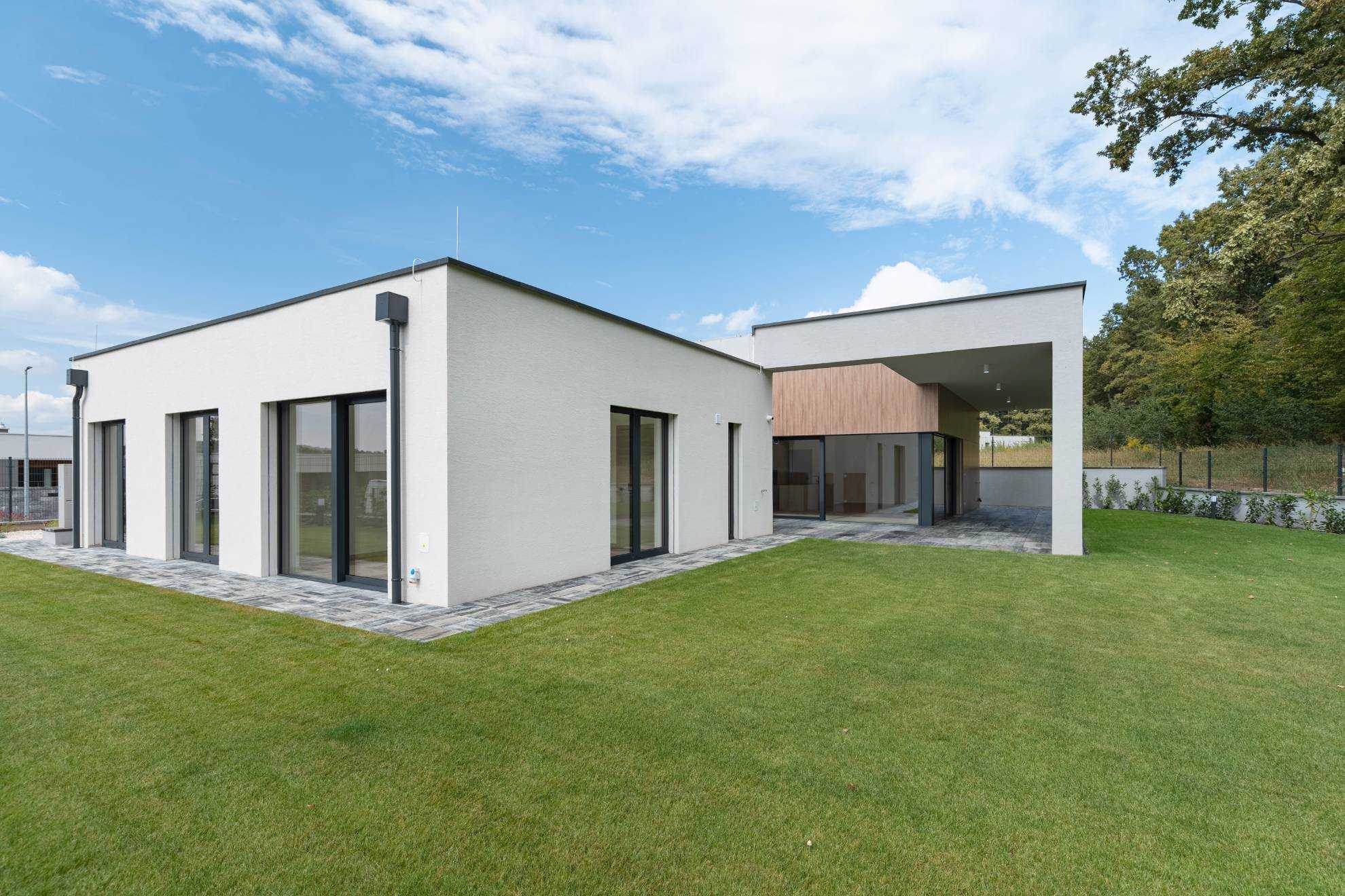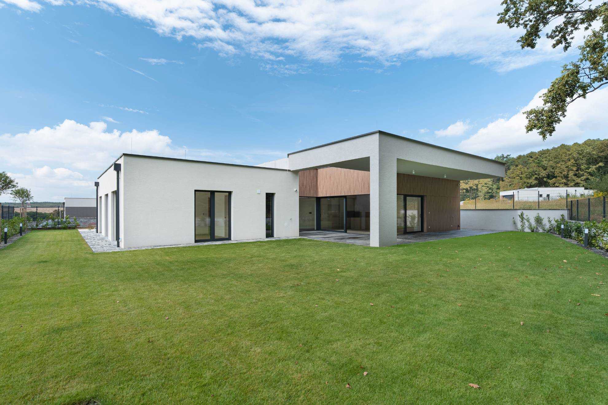 Dom sa predáva vo vysokom nadštandarde: kvalitné podlahy, kvalitné veľkoformátové HLINÍKOVÉ okná s exteriérovými elektrickými hliníkovými žalúziami, kvalitné interiérové dvere so zárubňami, 2 moderné kúpeľne s veľkoformátovými obkladmi a sanitou HANSGROHE, kuchynská linka so zabudovanými spotrebičmi BOSCH.